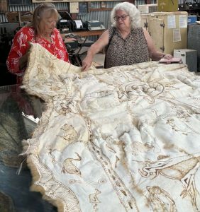 The large community cloak of 21 skins depicts the story of Emanjili, Diana Mudgee, a local Wiradjuri Mowgee woman, her life, country and her many descendants.